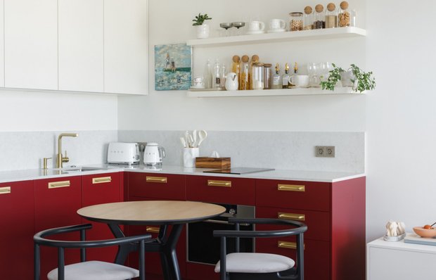 Угловой кухонный гарнитур выполнен в стильном бело-бордовом цвете и оснащен латунными ручками. От части верхних шкафов и от вытяжки Лина отказалась, чтобы сохранить эстетику.