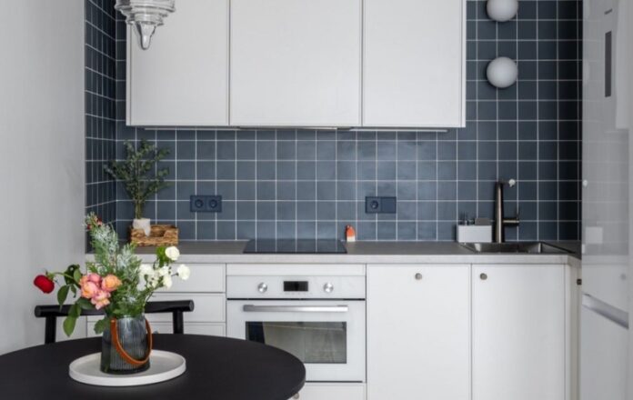В кухне есть отдельностоящий холодильник, который скрыт простенком, узкая посудомоечная машина, духовой шкаф с функцией СВЧ, варочная панель на три конфорки. Фартук из плитки темного цвета выложили до потолка. Он стал фоном для лаконичной светлой кухни. Затирку выбрали контрастную, в цвет фасадов.