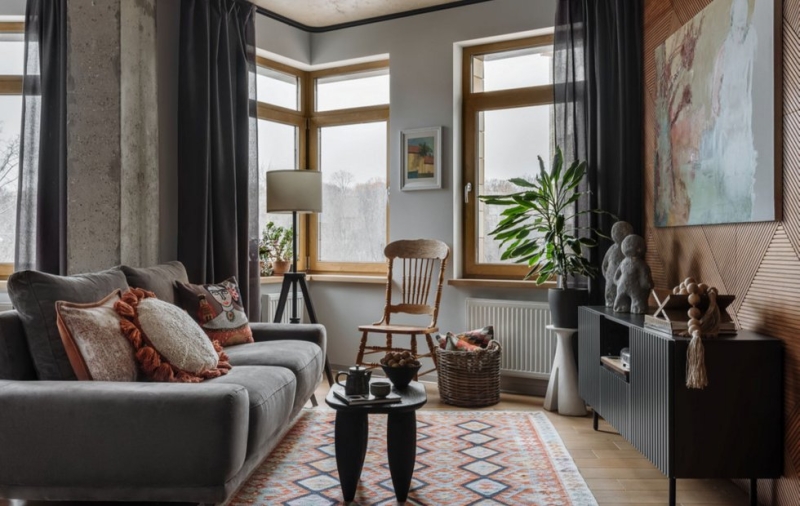 Четкие линии открытой проводки и черные карнизы подчеркнули фактуру бетона и добавили графичности.В квартире много интересных вещей, которые делают интерьер самобытным и индивидуальным. Например, тумба из дерева манго в гостиной, подвесное кресло в столовой, керамика ручной работы, авторские картины в кабинете.