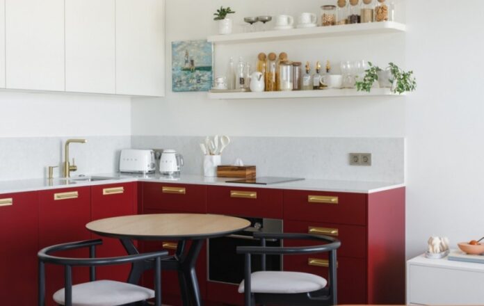 Несмотря на небольшую площадь, в кухне-гостиной удалось разместить достаточно вместительный угловой гарнитур. Для фасадов выбрали контрастное сочетание бордового и белого. Верхний ярус в цвет стен не кажется громоздким и смотрится легко. От части верхних шкафов и от вытяжки отказались, чтобы сохранить эстетику. Ручки на нижних фасадах интерпретируют ручки комода, смотрятся стильно и дорого.