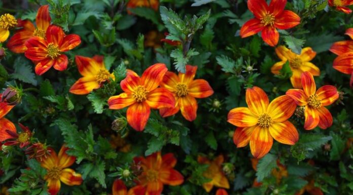 - Биденс Campfire Burst — лепестки трехцветные: от темно-красного до ярко-оранжевого и ярко-желтого.