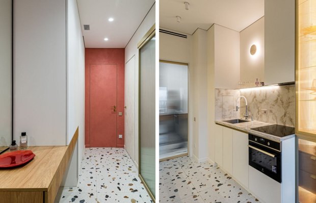 Фактурный керамогранит на стенах, плитка терраццо на полу, нежный розовый оттенок фасадов и эффектное освещение — в санузле применили красивые решения, которые сделали интерьер небанальным и очень стильным.