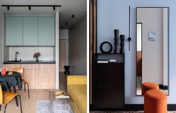 Компактная студия — яркий пример продуманного дизайна, где на 20 м² удалось разместить все необходимое, включая гардеробную, кухню и даже домашний кинотеатр. Дизайнеры Юлия Колесниченко и Надежда Воин адаптировали пространство для сдачи, но сохранили уют и индивидуальность.