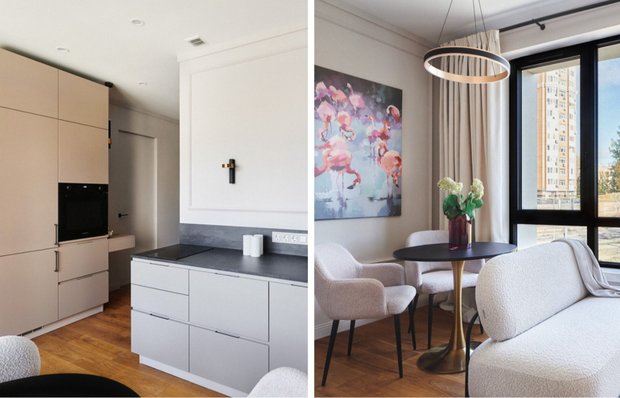 Для малогабаритных помещений лучше всего подходят светлые и пастельные тона. Они создают эффект легкости и воздушности и визуально расширяют пространство. Чтобы оживить интерьер, в эту гостиную привнесли яркий акцент — картину в зоне столовой. А фактурная обивка мягкой мебели и уютный текстиль добавили объема и комфорта.