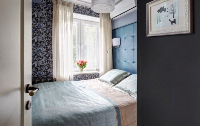 В проекте московской хрущевки дизайнер Валентина Савескул превратила крошечную спальню площадью 5,96 м² в комфортное пространство для отдыха. Несмотря на минимальные размеры, удалось разместить не только кровать, но и систему хранения, телевизор и даже создать уютную атмосферу.