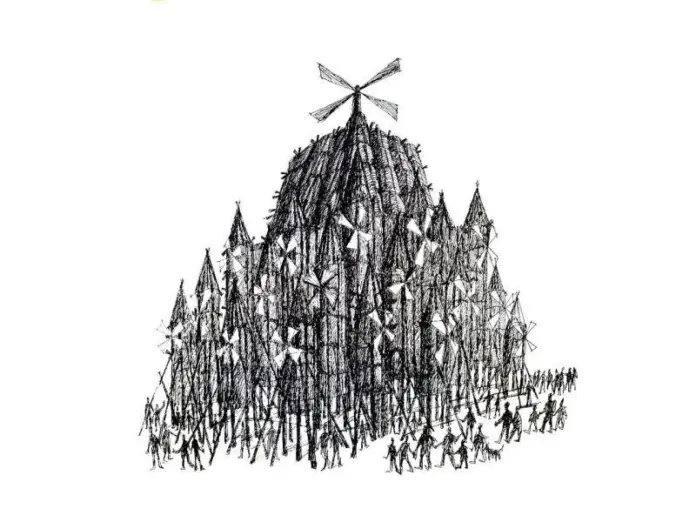 Автором объекта 2025 года стал основатель арт-парка Николай Полисский. «Мельницы» – это комплексное сооружение из 24 башен, центральная из которых достигает высоты 26 метров. В качестве материала использовали отработанное дерево – горбыль, паллеты, тонкомер – и сено.