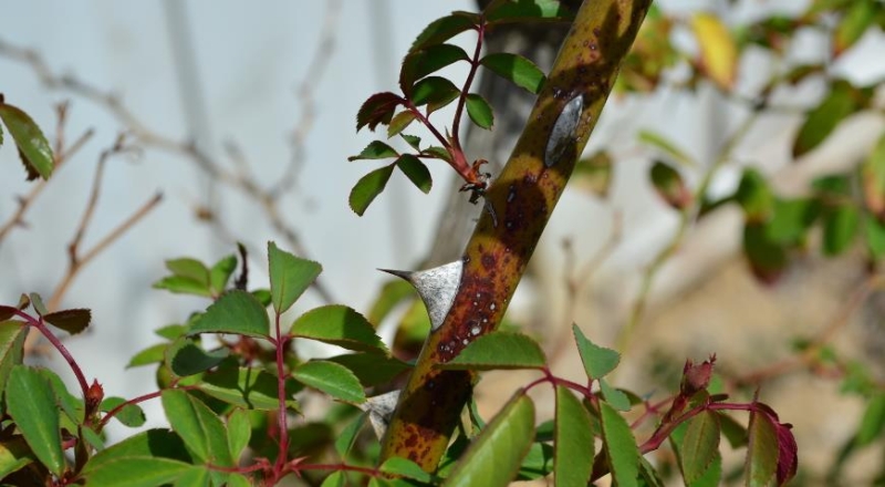 Главный признак заболевания – черные некротические пятна с красной каймой, хорошо заметные на побегах роз. По мере развития болезни кора подсыхает, трескается и отслаивается, пораженный побег погибает.