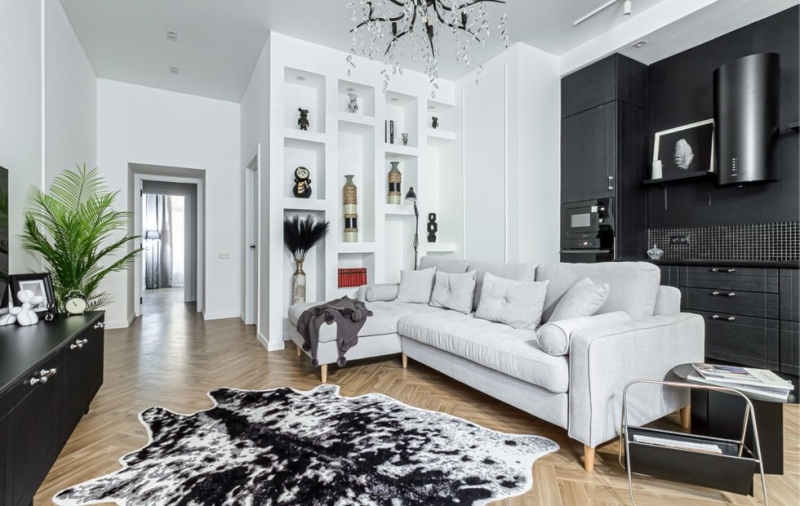 После перепланировки и капитального обновления здесь царит монохромная гамма, а классический дизайн чередуется с современными трендами
