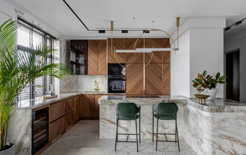 Ниши для крепления жалюзи в кухне-гостиной выполнены из мрамора. Это решение позволило минимизировать и скрыть массивное крепление, обычно выглядящее громоздко. В результате жалюзи выглядят изящно, сохраняя при этом полную функциональность.Особенно удачным стал широкий проем между квартирами — акцент всего интерьерного решения.