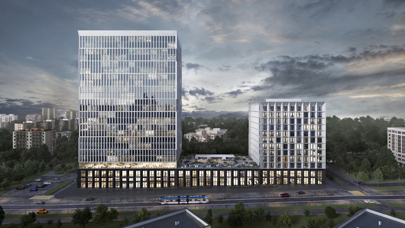 Как отметил Овчинский, комплекс площадью 74 тыс. кв. м состоит из двух корпусов высотой 23 и 12 этажей, которые объединены двухуровневым стилобатом. На первом этаже разместят ретейл, кафе и рестораны с террасами, открытые для горожан, на втором будет расположена торговая галерея, кафе для сотрудников и фитнес-студия.