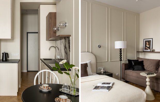 Эта студия 30 м² показывает: продуманное хранение не требует сложных решений. Достаточно грамотно распределить функции, использовать индивидуальную мебель и убрать все лишнее с глаз. Такие приемы легко повторить в любой небольшой квартире, тем более если она предназначена для аренды.