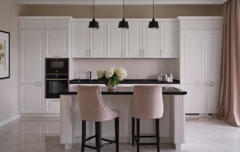 Кухня-гостиная занимает площадь почти 60 кв. м и имеет форму вытянутого прямоугольника с четырьмя входами-выходами, образующими две проходные вертикали. Это обусловило осевое наполнение пространства мебелью. В торце прямоугольника разместили кухню с островом. Изначально планировалась установка раздвижной стеклянной перегородки, разделяющей зону кухни от гостиной, но от этой идеи впоследствии отказались.