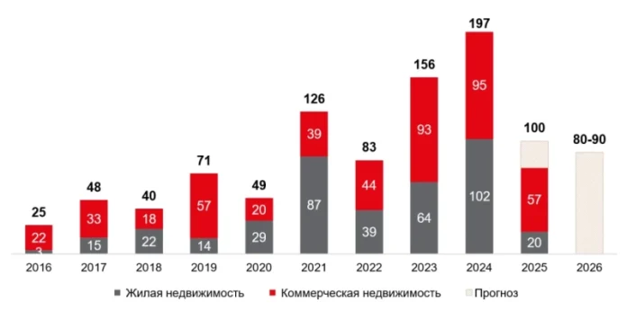 Исторически основной объем инвестиций приходился на жилую недвижимость, однако в 2025 году лидерство сместилось в сторону коммерческого сегмента. Данный разворот обусловлен высоким уровнем кредитных ставок, который сдерживает транзакционную активность девелоперов по приобретению участков под жилое строительство. На фоне завершения программы льготной ипотеки жилые застройщики все чаще обращают внимание на площадки под девелопмент коммерческой недвижимости, преимущественно офисной недвижимости.