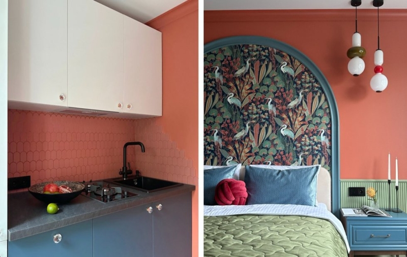 В спальне-гостиной на комоде стоит декор в виде рыбы, который дизайнер усовершенствовал своими руками. Красная лампа на рабочем столе гармонично сочетается с красными акцентами в спальне. Вторая спальня украшена прекрасной картиной с птицами — это уникальная ручная работа, которую нашли на маркетплейсе. Ее цвета перекликаются с обоями за изголовьем кровати.