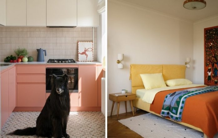 Интерьер с яркими деталями, природными текстурами и элементами mid-century