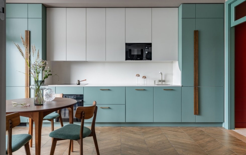Для проекта были выбраны глубокие, слегка приглушенные оттенки: черничный для спальни, теплый трюфельный — для гостиной и кухни, бирюзовый — для кухонного гарнитура и винный — для входной зоны. В санузле использовали плитку пыльно-розового цвета и цвета топленого молока. Кухня, выстроенная линейно и архитектурно, с вместительными и функциональными зонами хранения, не только выполняет утилитарную функцию, но и остается уютным пространством, центром притяжения квартиры. Гарнитур выполнен по индивидуальным чертежам в столярной мастерской и оснащен всей необходимой техникой.