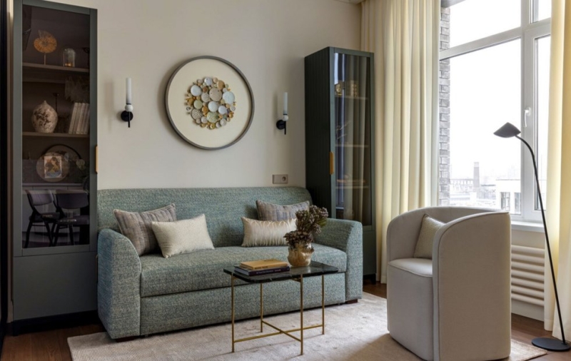 Заказчица из Кирова, руководитель крупного предприятия, обратилась к дизайнеру Ольге Рябовой с задачей оформить интерьер московской квартиры, где она останавливается во время командировок. Первоначальный запрос был на светлый интерьер в бежевых тонах. После встречи с заказчицей стало ясно, что ей необходимо не просто функциональное пространство для коротких визитов, а место для полноценного отдыха. В основу концепции легла идея «тихого моря» — изначально спокойного, но полного жизни внутри.