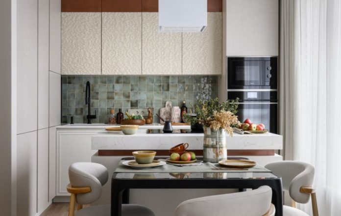 Гостиная, совмещенная с кухней, оформлена в цветах меди и бирюзы. Небольшая обеденная группа на двоих гармонично вписывается в пространство, создавая атмосферу уюта и комфорта для семейных ужинов. Центральным элементом кухни стал остров, в который интегрирована варочная панель. С одной стороны острова предусмотрены места для хранения, что позволяет эффективно организовать пространство и поддерживать порядок.