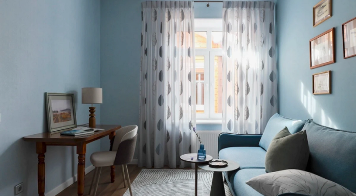Небесный оттенок с каплей серого визуально расширяет границы комнаты и наполняет ее воздухом. Он смотрится легче, чем насыщенный синий или чистый голубой, поэтому подходит на роль нейтрального фона. В такой цвет можно смело выкрасить все стены и даже повторить его в декоре или текстиле. Лучше всего его оттеняют белый и серый, а для создания сложной контрастной палитры сочетайте голубой с черным, фиолетовым или темно-коричневым.