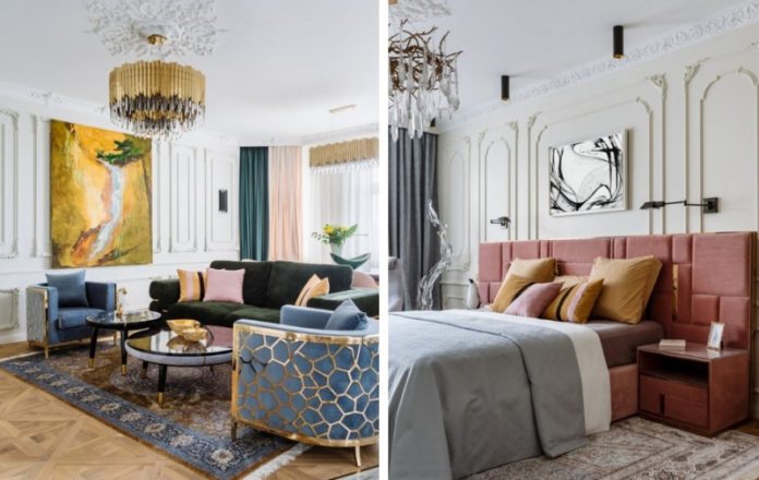 В этой квартире живет молодая семья с маленьким сыном. Заказчик приобрел две квартиры рядом с целью объединения: таким образом получилось пространство площадью 206 квадратных метров, включающее в себя пять комнат, кухню, три санузла, две гардеробные комнаты и постирочную. Большая гардеробная и санузел с хаммамом были обязательным условием.