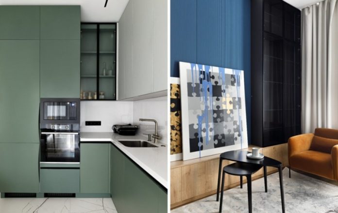 В спальне комод, украшенный печатью знаменитой картины Василия Кандинского, стал стильной фишкой интерьера. Его изготовили на заказ, и ожидание в два месяца полностью оправдалось, превратив мебель в изысканный арт-объект, который гармонично дополнил атмосферу комнаты. Шкаф в спальне выполнен в глубоком синем оттенке и предназначен для хранения сумок и украшений хозяйки. Его тонированное стекло с внутренней подсветкой превращает мебель в уютный источник фонового освещения в вечерние часы.