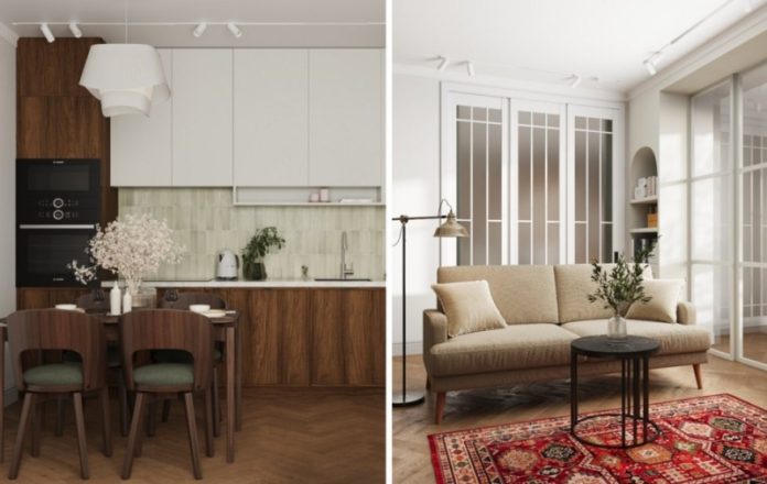 Дизайнеры Анна Лаковская и Гера Остин из студии ITEMS Bureau разработали проект для молодой семьи с маленькой дочерью. Глава семьи работает в сфере IT, а его супруга — искусствовед. Заказчики выразили пожелание создать светлый интерьер, своеобразный «фон» для их коллекции картин и предметов искусства. Также было важно использовать натуральные материалы и добавить акцентные цвета.