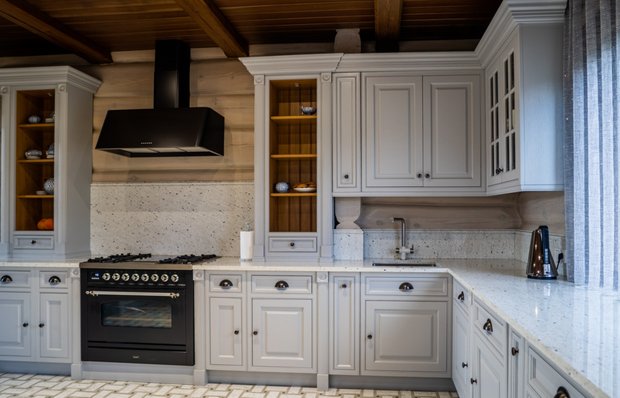 Напольное покрытие заменили на мозаику из керамогранита, созданную по индивидуальному эскизу. Кухонный гарнитур, выполненный из качественного и долговечного массива дерева, решили не менять. Фасады перекрасили, отреставрировали, заменили столешницу, фартук и фурнитуру. Варочный центр в современном стиле от итальянского производителя разбавляет классический облик мебели.