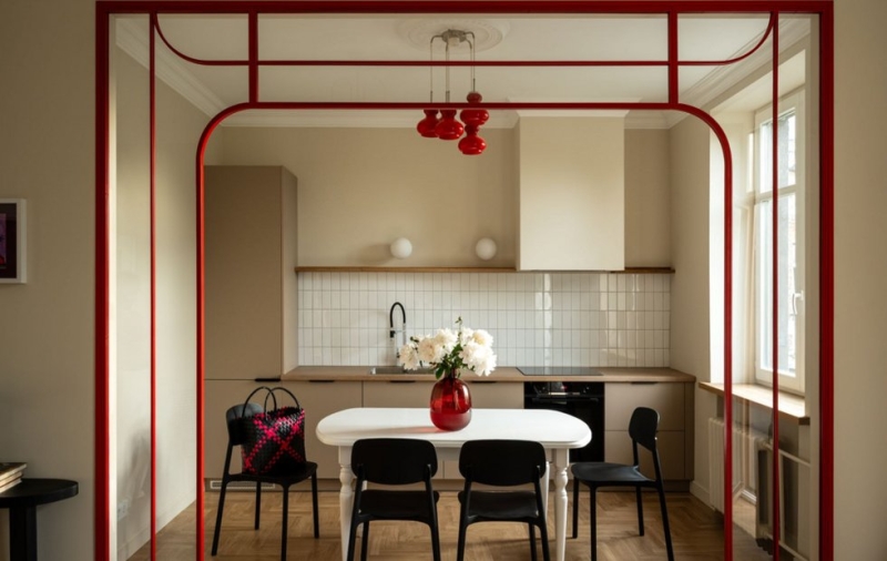 Гостиная и кухня объединены в единое пространство, которое визуально разделяет декоративная металлическая перегородка. Она выполнена в форме арки насыщенного красного цвета и служит не только для зонирования, но и ярким акцентным элементом, придающим интерьеру индивидуальность. На кухне для сохранения ощущения воздушности отказались от верхних шкафов, заменив их удобной дубовой полкой для декора и утвари.