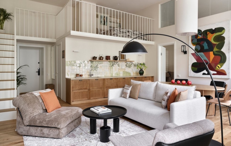 Пространство с высокими потолками и арочными окнами стало холстом для смелых дизайнерских решений
