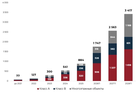 Объем существующих многоэтажных объектов на конец 2025 года составил около 100 тыс. кв. метров, а к концу 2026 года может вырасти до 316 тыс. кв. метров. В целом к 2028 году совокупный объем предложения Light Industrial в регионе может достичь 3,4 млн кв. метров, из которых 2,2 млн кв. метров придется на одноэтажные объекты и 1,2 млн кв. метров — на многоэтажные.