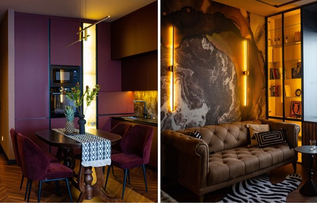 Компактная кухня оформлена фасадами насыщенного винного оттенка и отличается продуманной системой хранения. Колонну с техникой удачно интегрировали в нишу, дополнив ее узкой витриной во всю высоту стены. Витрина, оснащенная подсветкой, стала изящным экспозиционным пространством для красивой посуды. В центре помещения расположен обеденный стол со стульями в благородной обивке, цвет которой перекликается с оттенком кухонных фасадов, создавая гармоничную цветовую связь.
