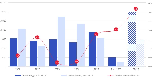 В первые три месяца 2026 года объем спроса оказался кратно ниже объема нового предложения, а объем готовых вакантных площадей (без учета субаренды) превысил психологически знаковую отметку в 1 млн кв. метров. На фоне сокращения темпов поглощения рынок постепенно переходит к позиции арендатора. Об этом «Стройгазете» сообщили в пресс-службе консалтинговой компании Nikoliers.