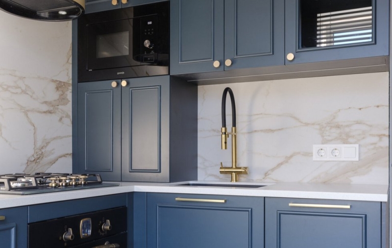 - Столешница: дешевая ДСП-столешница при регулярном контакте с водой набухает и разрушается за 3-5 лет. Влагостойкая ДСП с хорошим покрытием, постформинг, кварцевый камень или натуральный: это вложения на 10-20 лет.