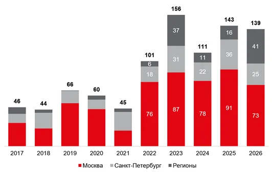 Совокупная доля инвестиционных вложений в региональную недвижимость, напротив, продемонстрировала высокий результат – 47 % или 66 млрд рублей. В январе-марте 2026 года там был закрыт ряд крупных транзакций: продажа двух ТЦ «Аура» в Ярославле и Сургуте, продажа проекта ЖК «Донские Легенды» в Ростове-на-Дону и продажа логопарка «Центр Агротехнологий». Наибольший объем инвестиций был зафиксирован лишь в 2023 года (68 млрд рублей), когда в аналогичном периоде были закрыты сделки по покупке гостиничного портфеля группы Wenaas и курорта «Архыз».