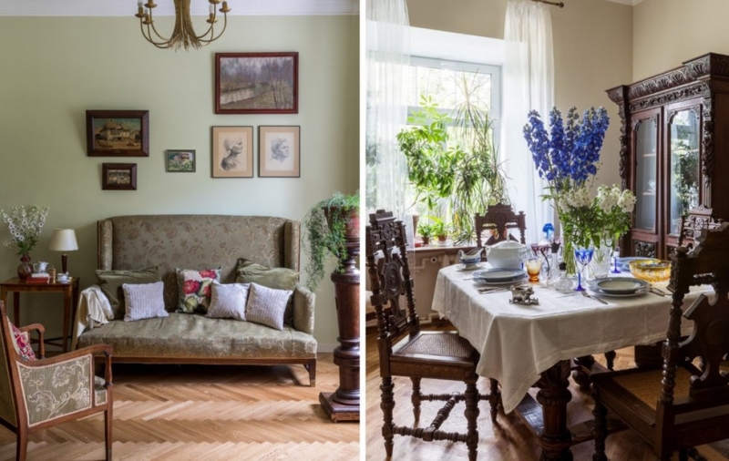 При наличии в квартире множества старых книг, картин и мебели, отделочные материалы становятся фоном, который не должен отвлекать от основной композиции.